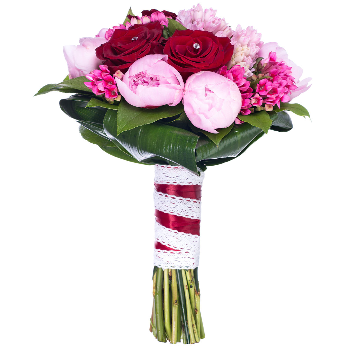 Пион розовый, роза одноголовая крансая, бувардия розовая, аспидистра. Упаковка (лента, пленка, крафт, сетка, пленка матовая)
