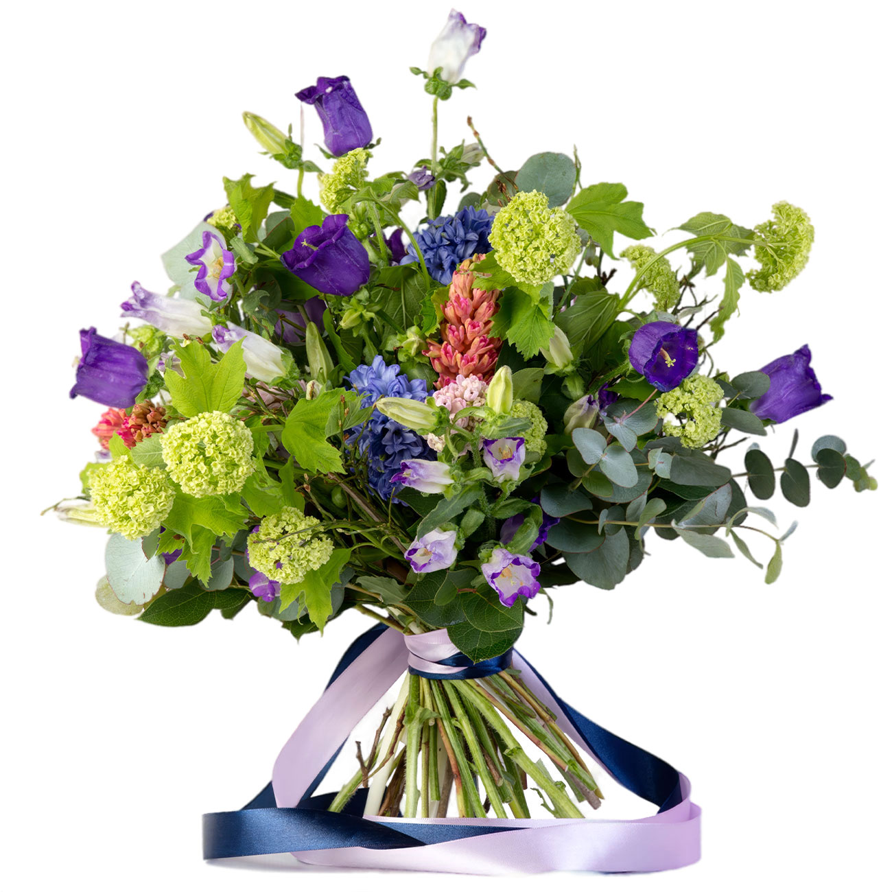 Колокольчик, вибурнум зеленый, гиацинт разноцветный, эвкалипт. Упаковка (лента, пленка, крафт, сетка, пленка матовая)
