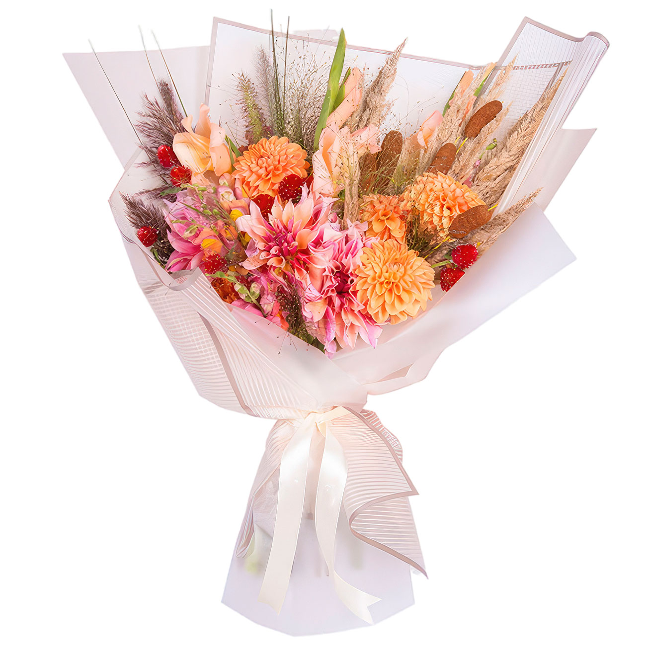Георгина оранжевая и розовая, гладиолус персиковый, львиный зев, детали, сухоцветы. Упаковка (лента, пленка, крафт, сетка, пленка матовая)