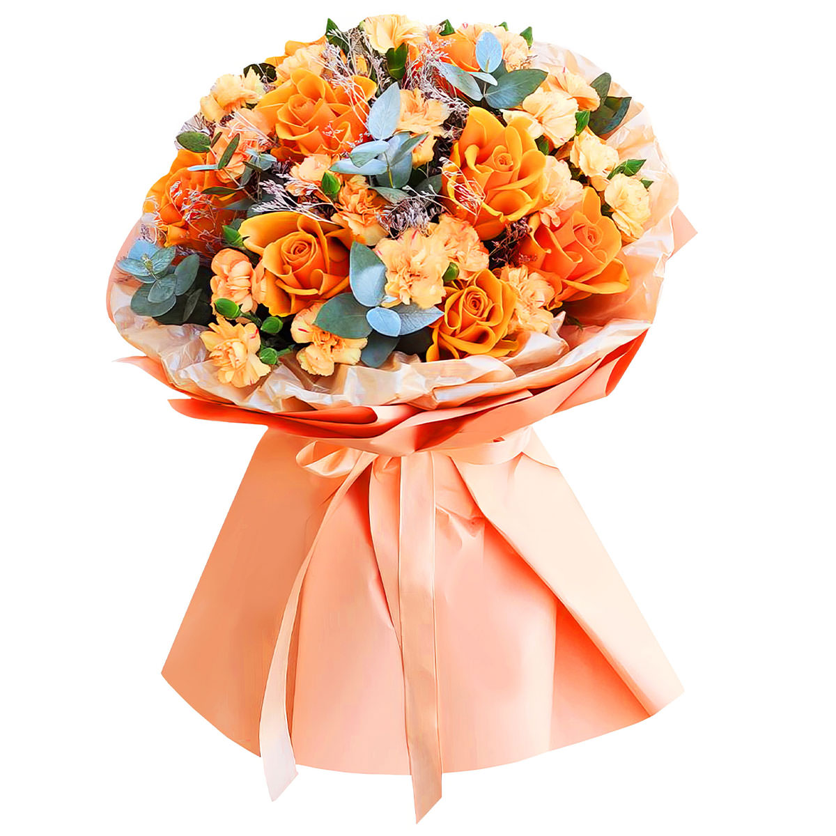 Роза одноголовая оранжевая, каланхоэ, эвкалипт. Упаковка (лента, пленка, крафт, сетка, пленка матовая)