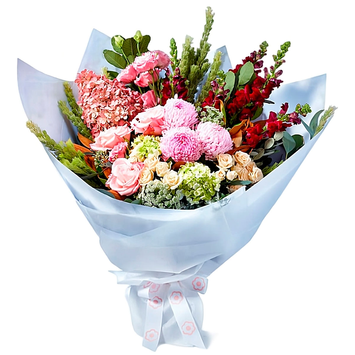 Роза кустовая персиковая, роза одноголовая розовая, одноголовая хризантема розовая, гортензия розовая, маттиола бордовая, зелень. Упаковка (лента, пленка, крафт, сетка, пленка матовая)