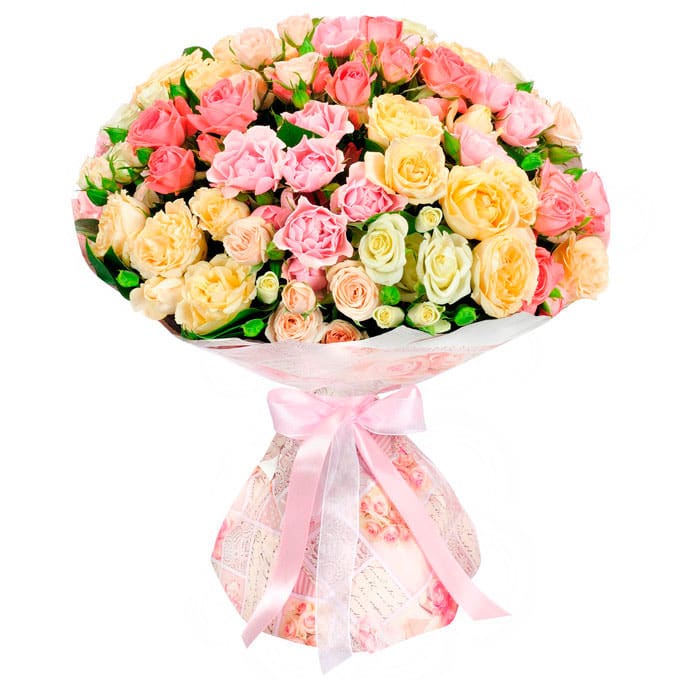 Розы кустовые микс (желтая, розовая). Упаковка (лента, пленка, крафт, сетка, пленка матовая)