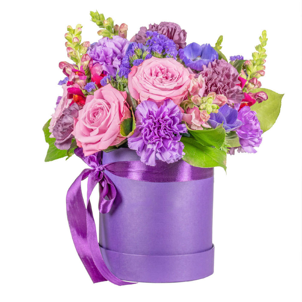 Роза одноголовая розовая, гвоздика сиреневая, дельфиниум, лимониум. Упаковка (шляпная коробка, квадратный бокс, коробка сердце, оазис)