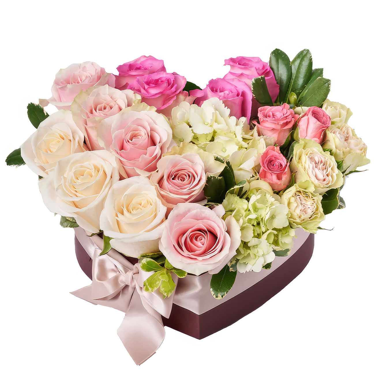 Роза одноголовая розовый микс (кремовая, розовая), кустовая роза розовая, гортензия кремовая. Упаковка (шляпная коробка, квадратный бокс, коробка сердце, оазис)
