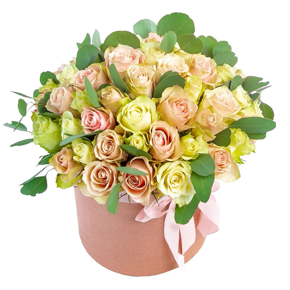 Роза одноголовая микс (кремовая, желтая), эвкалипт. Упаковка (шляпная коробка, квадратный бокс, коробка сердце, оазис)