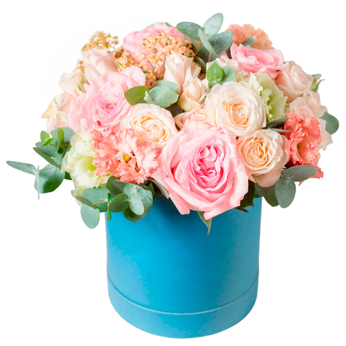 Роза пионовидная розовая, роза кустовая нежно розовая, эустома коралловая и белая, эвкалипт. Упаковка (шляпная коробка, квадратный бокс, коробка сердце, оазис)