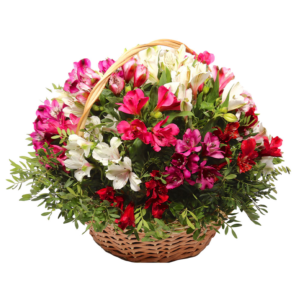 Цветы в корзинке «Краски альстромерий» с доставкой по г Пугачёв: вы можете купить букет в цветочном супермаркете «Флормания» по цене от 3490 руб.